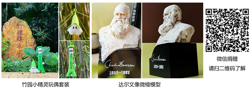 子项目 2 | 学院文化建设基金项目(定额捐赠) | 微信扫码 ① 55元-竹生生(竹笋宝宝玩偶) ② 59元-竹科科(竹子玩偶) ③ 99元-玩偶套装(竹生生+竹科科) ④ 199元-达尔文像微缩模型 ![]() | ① 电子捐赠收据 ② 电子捐赠证书 ③ 回赠对应的文创产品 |