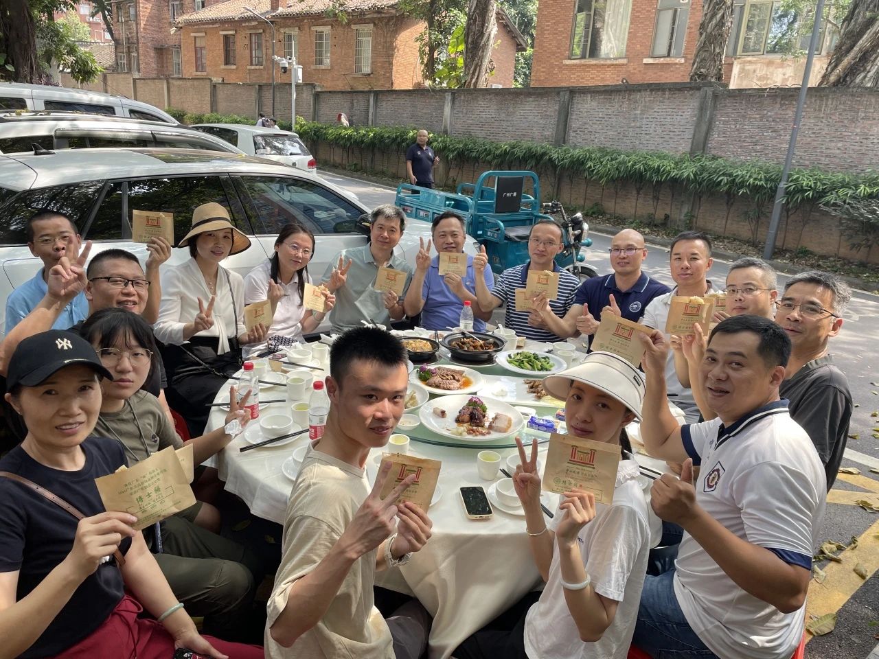 顺利拍完祝福视频和照片后,校友们去康乐园进行午宴。校道旁,大树下,大家一边吃着中大独有的博士饼,一边回忆着过去的校园生活。笑声此起彼伏,那段无忧无虑的时光,一起奋斗的日日夜夜,宿舍里的欢笑,课堂上的趣事,仿佛历历在目。一砖一瓦,一草一木,仿佛都沉醉在这段珍贵的交流中,见证着94级生化班和微生物班的校友们友谊的延续。