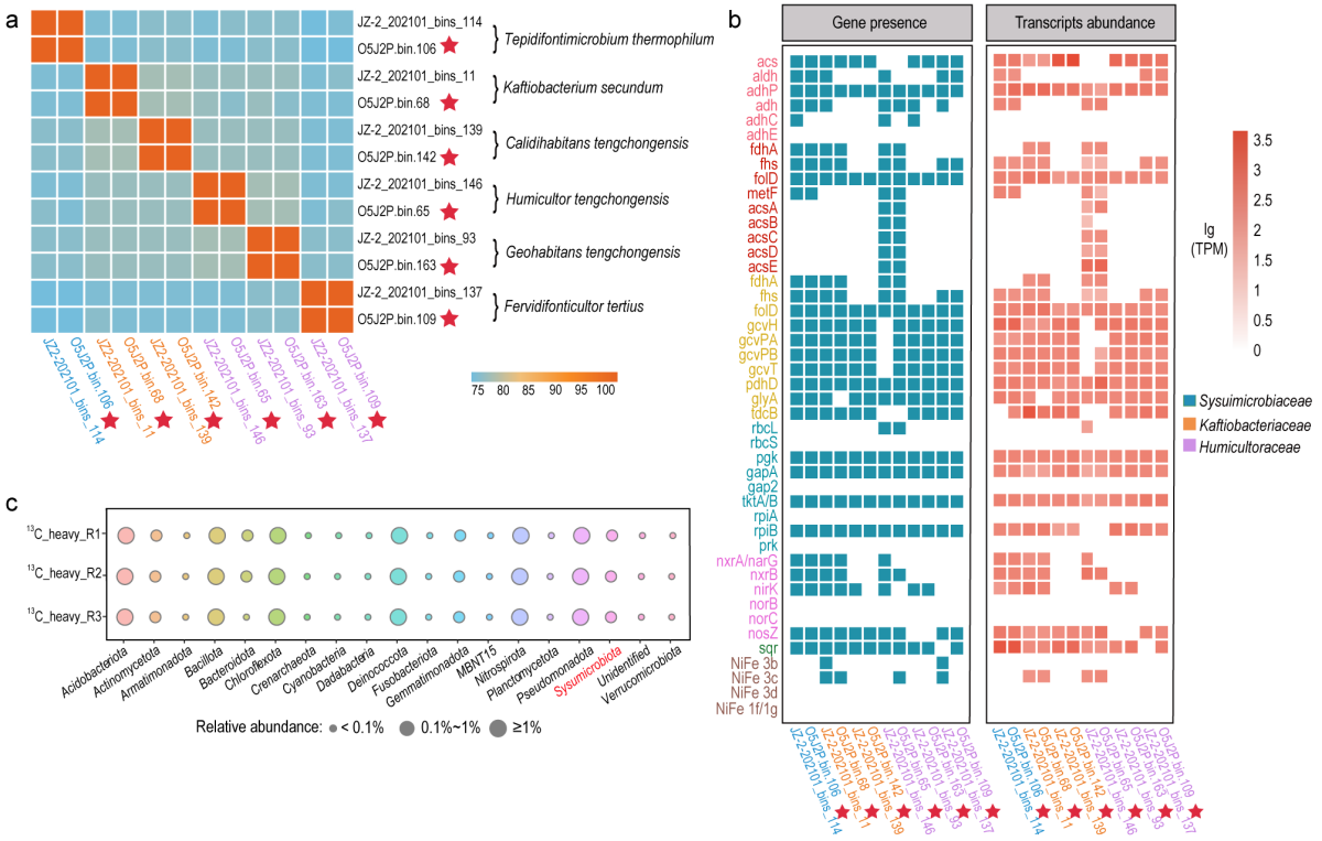 图3 富集培养(a),转录组(b)及DNA-SIP(c)实验结果证实了中大微菌门(Sysuimicrobiota)的化能自养能力
