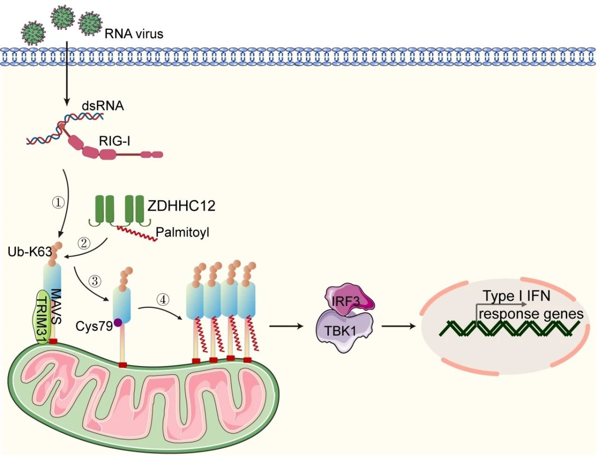 图1 ZDHHC12介导MAVS棕榈酰化修饰,促进抗病毒免疫反应的工作模型