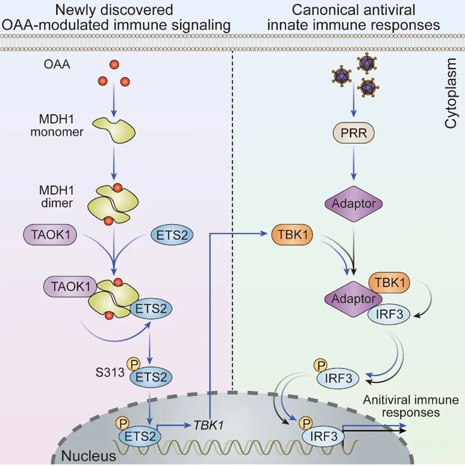 研究人员观察到细胞在感染IAV后,通过ATP-柠檬酸合成酶(ACLY)促进草酰乙酸水平上升。在MDH1缺失细胞中,草酰乙酸的抗病毒活性被消除。在此基础上,研究人员发现了一条独立于模式识别受体途径的新信号通路:草酰乙酸作为信使分子,能够被MDH1识别,并促进MDH1的二聚化以招募激酶TAOK1和转录因子ETS2;TAOK1进而磷酸化ETS2,引起ETS2的核转位,激活以TBK1为核心的固有免疫应答。这条由草酰乙酸介导的信号通路对于促进和维持抗病毒固有免疫发挥重要作用。