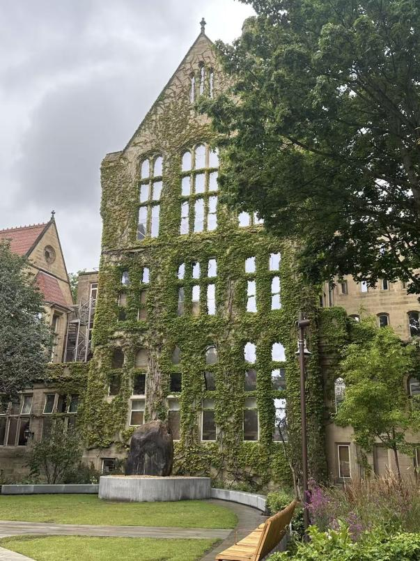 第一天是学校组织的暖场活动,老师们大致介绍了这几周的学习安排后,我们来到破冰环节,并在助教的带领下参观了这座开放式的校园。这里有着与我们中大不同的美,校园里的哥特式建筑散布在街道各处,绿色的藤蔓爬满整面砖墙,在校园里,不时有一些学生在拍毕业照,有时可见三两学生讨论着问题从我们身旁擦肩而过,校园里洋溢着青春活力,使我对接下来的学习充满期待。