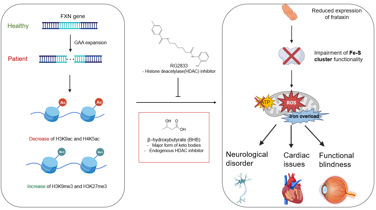 FRDA是由FXN基因上游GAA重复序列大量扩增,使线粒体中Fe-S簇的关键蛋白frataxin表达减少,进而导致Fe-S簇功能受损的疾病,可危害神经、心血管、视力等。先前研究表面,GAA扩增导致frataxin表达减少的机理包括H3K9ac and H4K5ac的下调。而一类组蛋白去乙酰酶(HDAC)抑制剂RG2833,研究表明其可有效挽救frataxin表达的下调。而β–hydroxybutyrate (BHB),作为体内酮体的主要形式,它同时也是一类内源的HDAC 抑制剂(图1)。因此推测,生酮饮食是否有可能通过作为HDAC抑制剂的途径同样挽救frataxin表达,从而治疗FRDA。