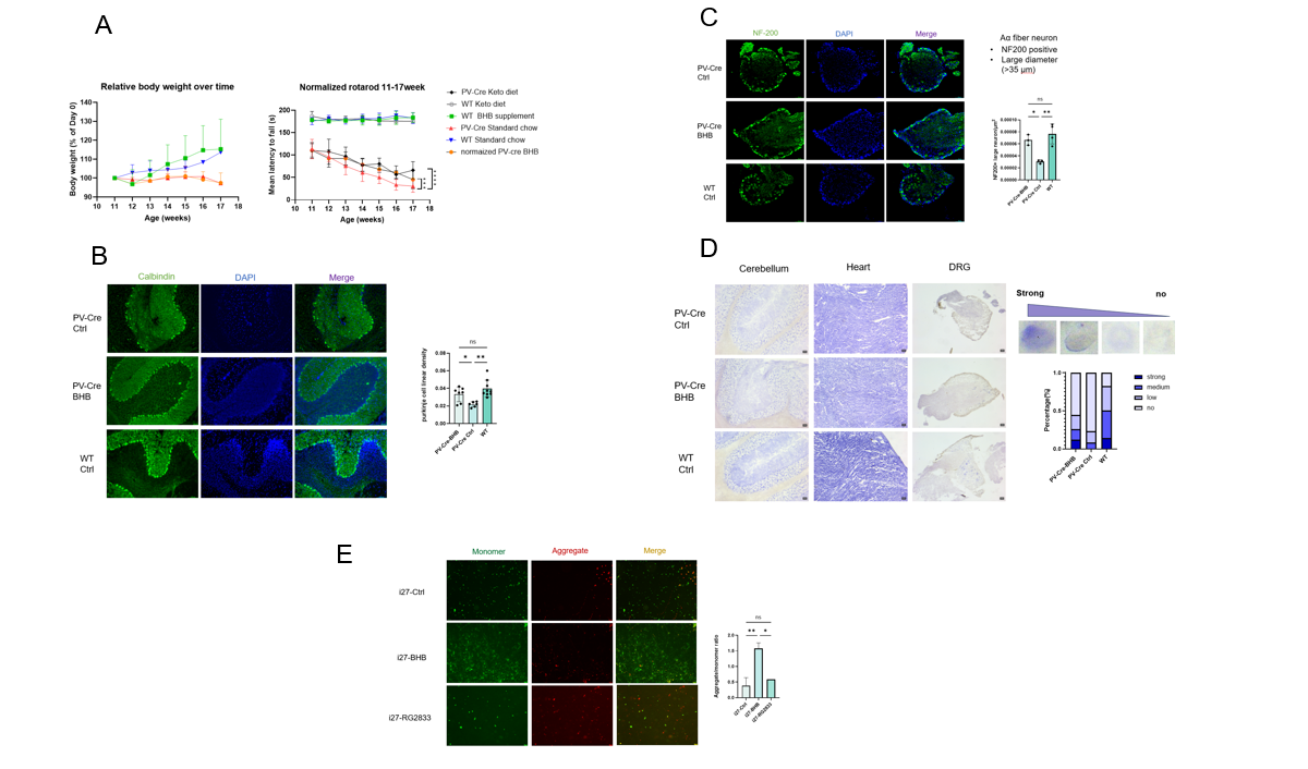 我们使用条件敲除FXN基因的PV-Cre小鼠作为疾病模型,其在表达parvalbumin的细胞中会敲除FXN基因,从而模拟FRDA的发病。Parvalbumin主要由神经元表达,包括中枢神经系统中小脑内的Purkinje细胞及外周神经系统中背根神经节(dorsal ganglion root, DRG)内的本体感觉神经元。通过测量小鼠在rotarod上的停留时间,以反映BHB及生酮饮食对其病症的缓解程度。结果表明添加BHB补剂和以生酮饮食饲料喂养的PV-Cre小鼠,其在rotarod实验中的表现相较以普通饲料喂养的PV-Cre小鼠有40%的改善(图2A)。