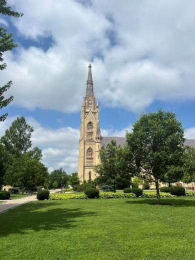作为以宗教人物命名的大学,圣母大学的教堂自然也是十分宏伟的(图4)。似乎每日早晚都有弥撒,但遗憾从来没进去参观过。据说每个宿舍楼也都配有一个小教堂供学生礼拜用,可见宗教氛围浓厚。或许是得益于Indiana州本身社会文化比较保守,也有可能是因为教义约束或是学校规章,校园内风气清朗文明,街道也宽敞洁净,反而较之芝加哥等大城市市中心的街区更加令人舒适。