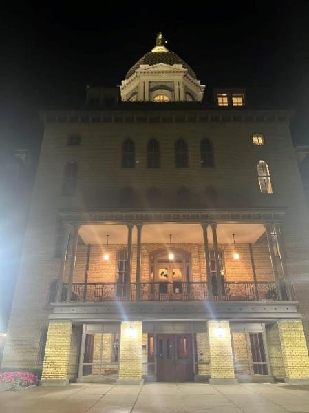 圣母大学内建筑多为欧洲传统风格,其中最惹眼的建筑之一即是中央的Main Building,现用作行政办公楼,据说穹顶由纯金打造,蔚为壮观(图3)。