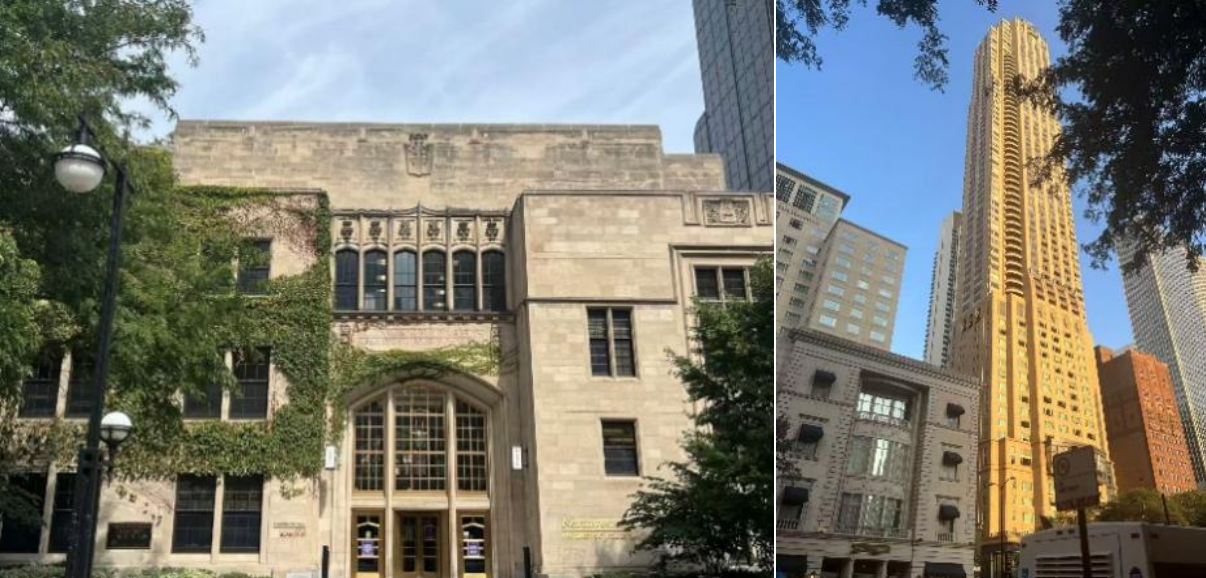 此外,我还联系了西北大学的Dong-Hyun Kim教授。与中大相似,西北大学的院系也分立各处,医学院、法学院等位于一处,学校主体则在另一处。当日前往医学院面见教授之后,便骑行至西北大学本部观览。其法学院、医学院等位于较为芝加哥繁华的地带(图11),本部则较之更加偏僻,但规模较大,古典、现代风格的建筑兼而有之(图12)。当日正值其新生入学之际,校内景象十分热闹。