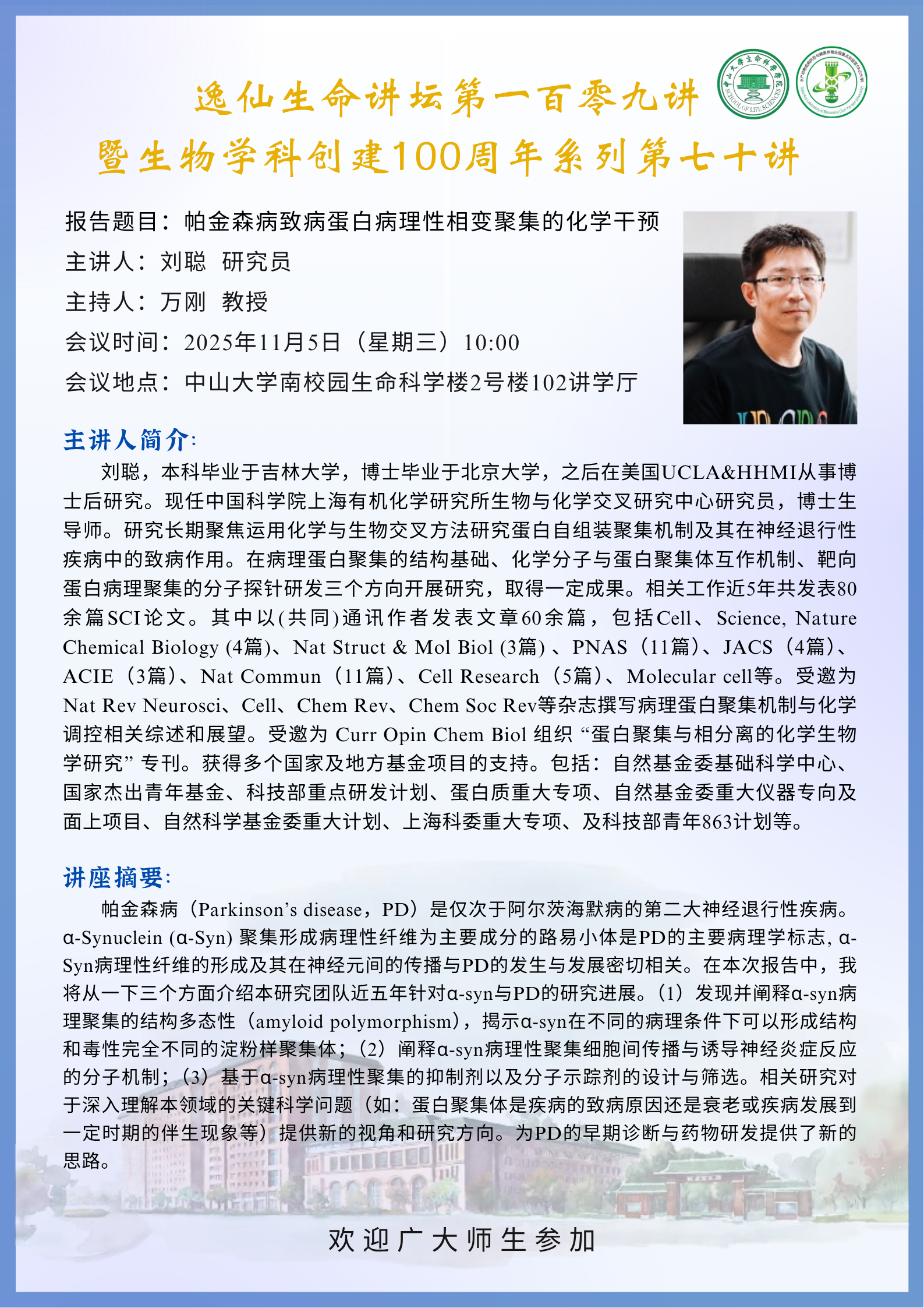 2025年11月5日发卡平台 逸仙生命讲坛第109讲:帕金森病致病蛋白病理性相变聚集的化学干预
