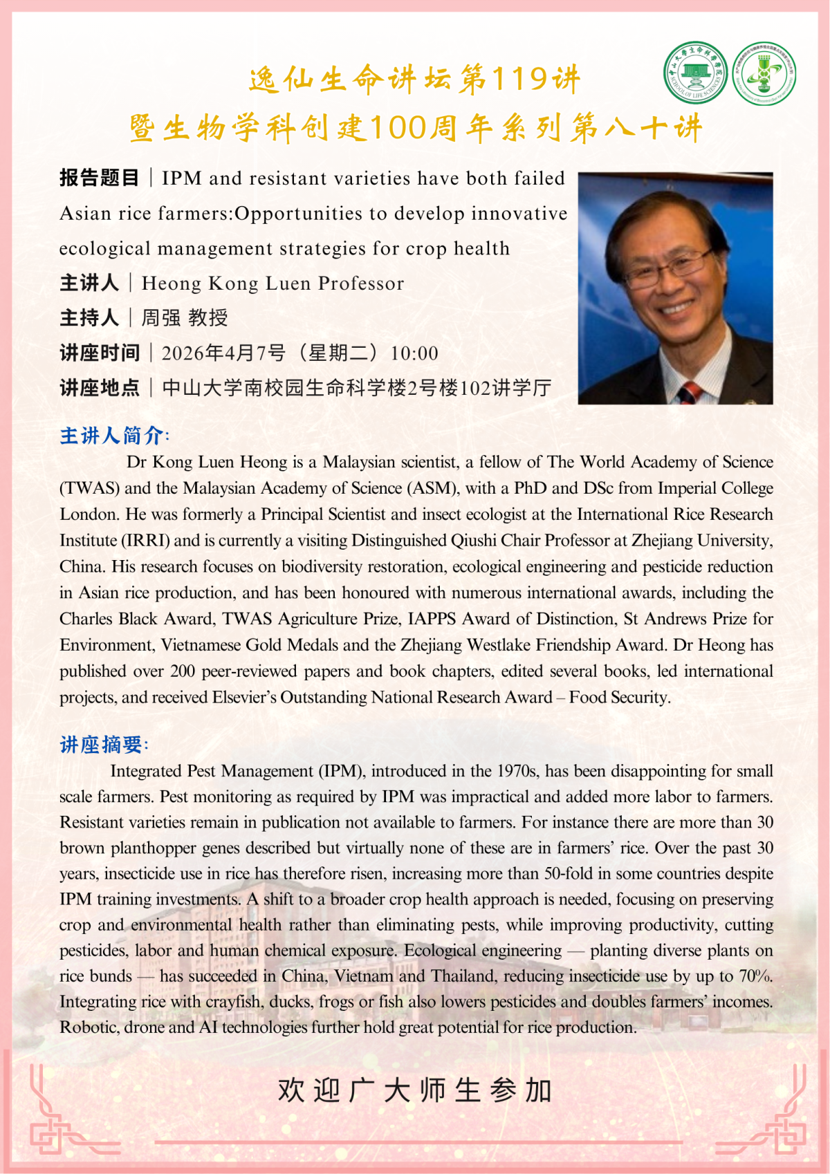 2026年4月7号逸仙生命讲坛119讲:IPM and resistant varieties have both failed Asian rice farmers:Opportunities to develop innovative ecological management strategies for crop health
