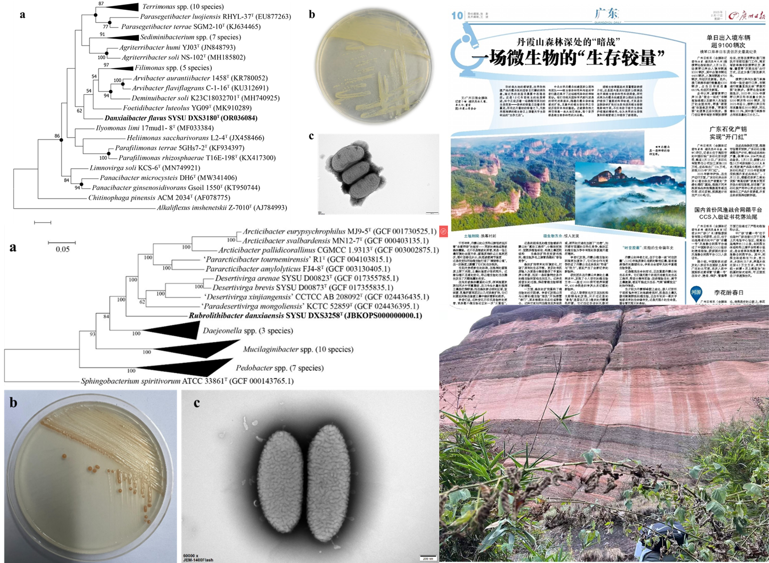 3)微生物调查组团队在丹霞山土壤微生物调查发现了首例细菌新属级别物种,并命名为黄色丹霞杆菌(Danxiaibacter flavus),第二例细菌新属级别物种,命名为丹霞红岩杆菌(Rubrolithibacter danxiaensis)。这两篇文章发表后,先后经过了人民日报、中国新闻网、南方日报等二十多个新闻媒体的宣传报道,丹霞山微生物多样性获得了广泛的关注。