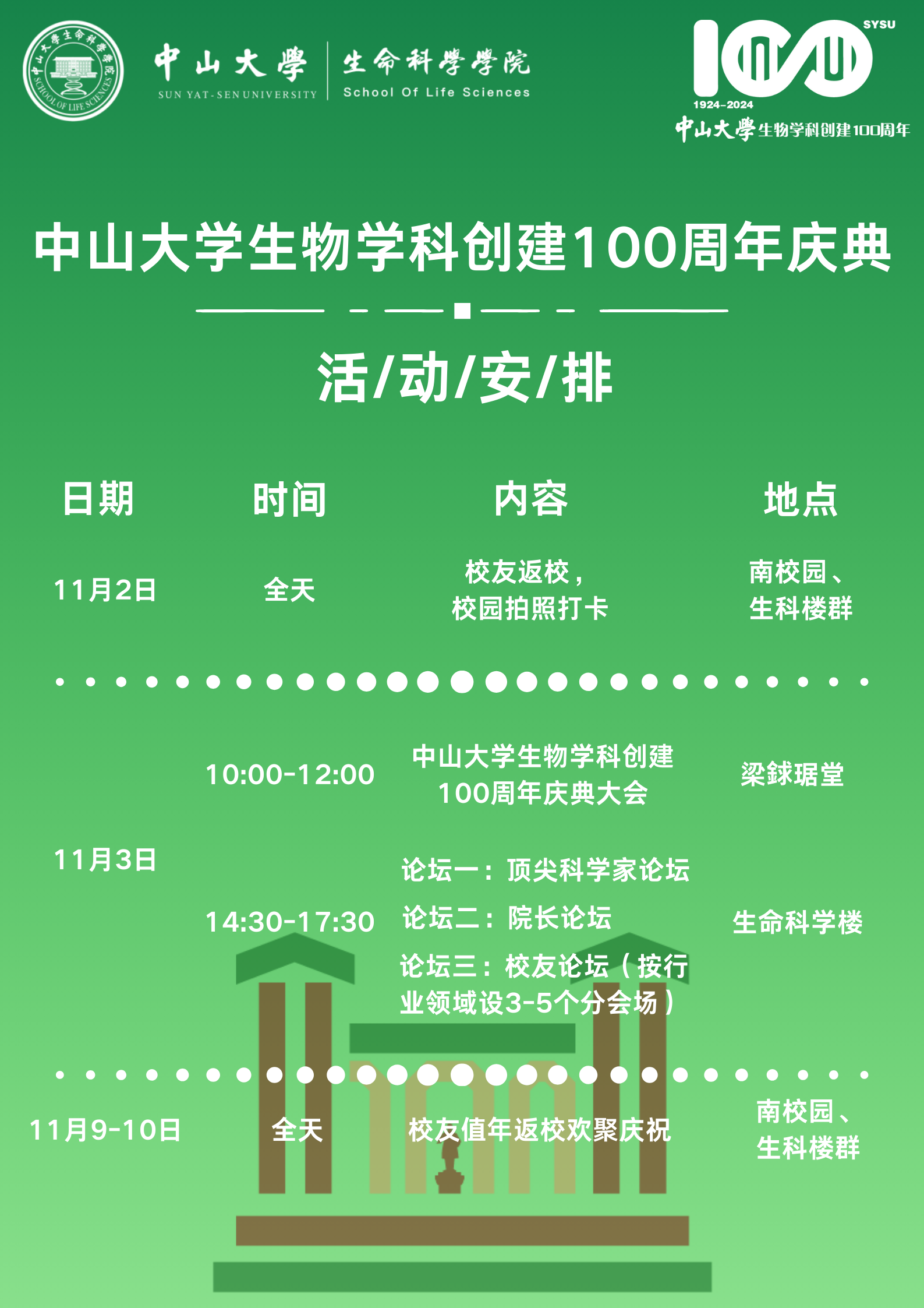 生物学科创建100周年”庆典大会兹定于2024年11月3日在广州校区南校园举行。我们热忱期盼广大校友重返母校、畅叙情谊,社会各界贤达拨冗莅临、共谋发展、共擘华章!