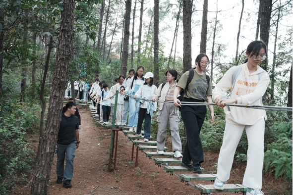 在进行了简单的休整后,同学们跟随各自的小队踏上了重走长征路的旅程。攀过陡峭的山路,走过狭窄的小道,踱过摇晃的吊桥,艰难的路况让同学们更加切身体会到当年长征的不易,领悟到长征精神的伟大。即使道路难攀,但同学们仍斗志昂扬,挥舞着旗帜抵达终点。
