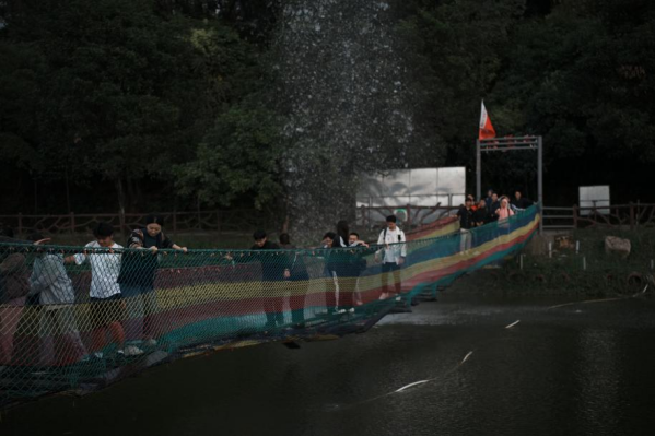 随后,各队同学来到了泸定桥边,进行白日的最后一项活动——飞夺泸定桥。不顾不断暴起的水柱,不顾不断摇晃的断桥,领队同学一马当先,同学们也争先恐后,踏上这条艰险的“泸定桥”。途中可能会有恐惧,但全程没有一位同学放弃,最终所有同学都越过这条艰险的断桥,抵达对岸。