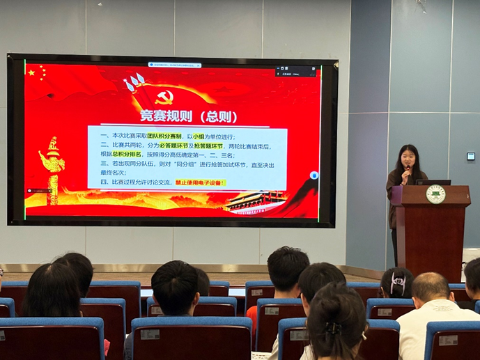 在活动筹备阶段,支部委员会充分听取党员想法,广泛征求意见,精心策划活动并积极动员参与。比赛开始前,党支部邀请到了生态系统演化与修复党支部书记周婷老师出席本次活动。周老师在致辞中深刻阐述了党史、党章学习与生态保护的紧密联系,鼓励大家以赛促学,将理论知识转化为实际行动,为现场的参赛者注入了强大的精神动力。同时,现场还特别设置了与答题相关的视频展示环节,三段视频带领大家穿越时空,重温党史中的峥嵘岁月,见证新时代的伟大变革,感受生态文明建设的生动实践。每一段视频都如同一个生动的故事,让大家深刻感受到了党的光辉历程和生态保护的重要性,现场气氛热烈非凡。