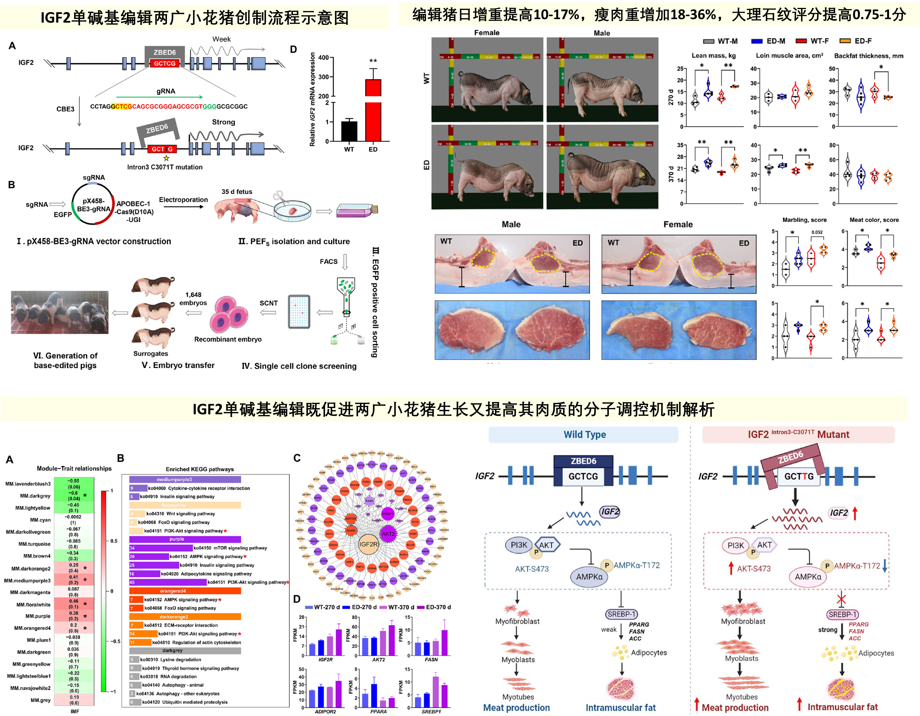 2. IGF2基因编辑两广小花猪不仅产肉量提高30%以上,肌内脂肪含量、肉色和保水性等肉质性状均获得大幅提升,打破了常规育种在追求高瘦肉率育种目标时引起肉质下降的难题,为地方猪遗传改良和生产效率提高提供了优秀范例。