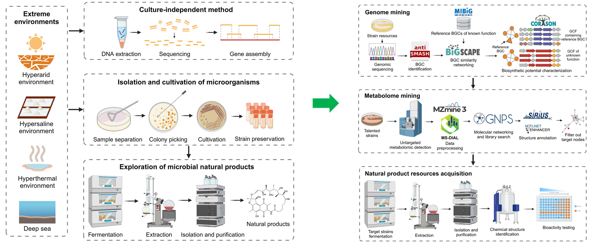 3.1 极端环境,如极度干旱沙漠、海洋、盐湖、热泉等中蕴藏着丰富多样的极端微生物。其中包含众多未被发现的微生物,被称为“微生物暗物质”。我们提出了多组学大数据指导下的极端微生物资源高效发现,进而深入挖掘应用微生物代谢潜能的理性实施技术路径,助力合成微生物学与生物制造的蓬勃发展。