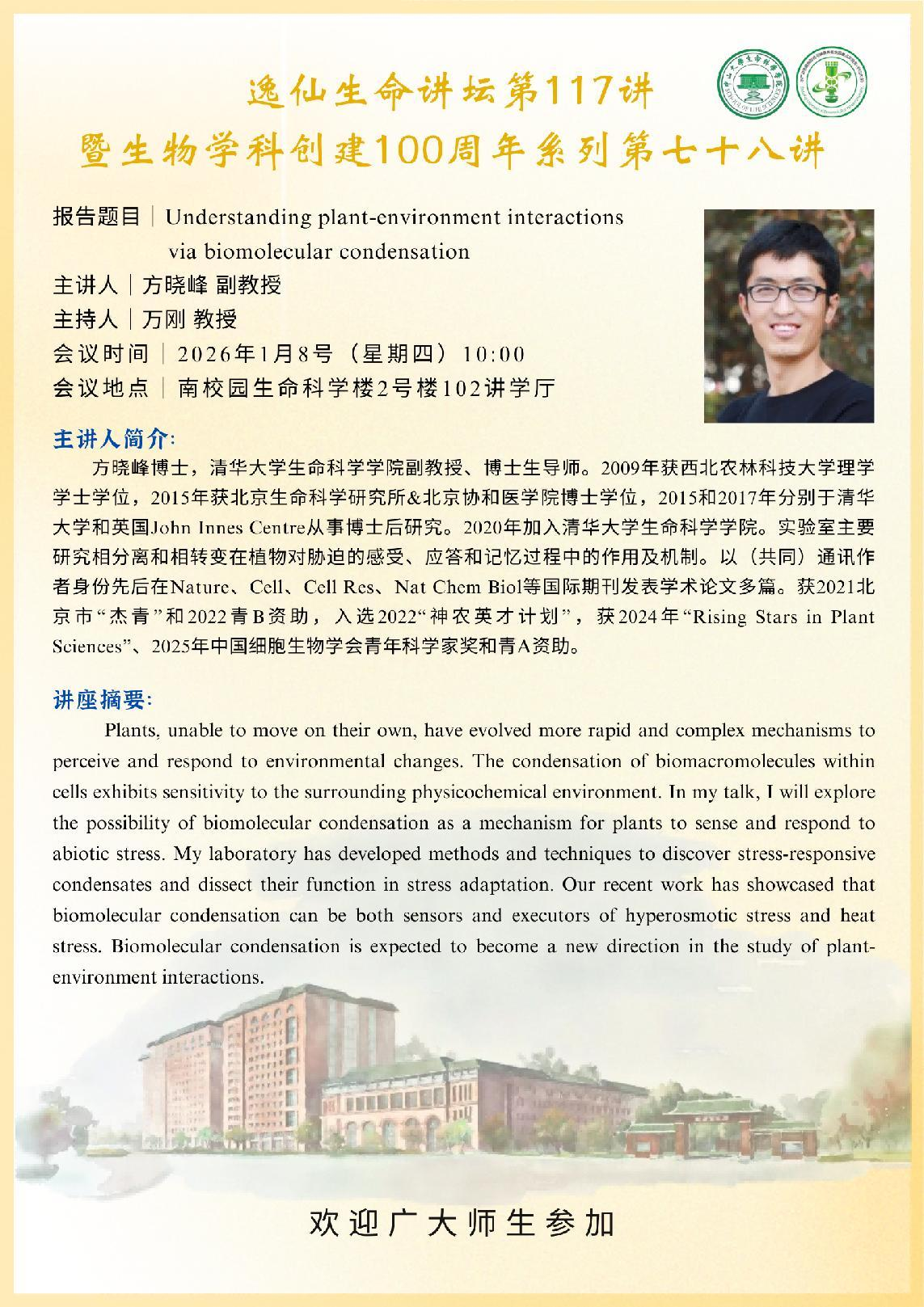 • 2026年1月8号逸仙生命讲坛117讲:Understanding plant-environment interactions via biomolecular condensation