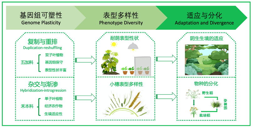 (3) 聚焦于植物防御、耐荫表型与杂草性状等关键表型,揭示“复制与重排”和“杂交与渐渗”等进化机制,促进关键适应性表型性状形成的分子基础 (详见图示)。