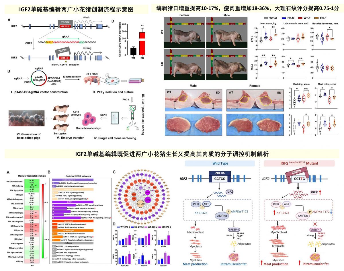 2. IGF2基因编辑两广小花猪不仅产肉量提高30%以上,肌内脂肪含量、肉色和保水性等肉质性状均获得大幅提升,打破了常规育种在追求高瘦肉率育种目标时引起肉质下降的难题,为地方猪遗传改良和生产效率提高提供了优秀范例。
