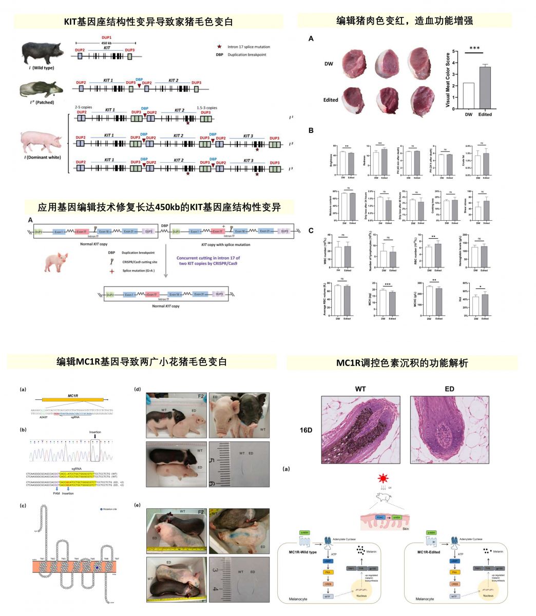 4. 毛色是决定家猪品种特征和商品猪销售价值的重要性状。修复KIT结构性变异的大白猪肉色性状大幅提升,并可用于杂交生产黑色优质商品猪,丰富了优质猪配套组合,具有较大的市场应用前景;MC1R基因编辑猪毛色发生显著性改变,证明其是控制家猪色素积淀的关键基因,为家猪毛色修饰提了新策略。