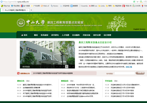 实验室固定研究人员2015年发表SCI收录论文共50篇,其中署名实验室的论文有35篇:以实验室为第一署名单位论文26篇(五年平均影响因子8.2),非第一署名单位论文9篇(我室固定人员为第一作者或通讯作者)。影响因子5以上论文27篇(其中10以上论文12篇)。申请发明专利8项,获得授权发明专利3项。屈良鹄教授团队2014年在《Nucleic Acids Research》上发表的“starBase v2.0”研究论文被中国科学技术信息研究所评为2014年度“中国百篇最具影响国际学术论文”。黄军就副教授利用CRISPR-Cas9基因编辑技术成功修改人类胚胎DNA的研究,为治疗遗传病地中海贫血提供了新的治疗可能而被《自然》杂志评选为2015年度十大人物,并入选中国与全球化智库(CCG)发布“2015年度中国留学人员创新创业50人”。此外,我室作为牵头单位之一,承担并完成了我国非编码RNA研究战略报告《我国RNA研究的重大问题》的组稿工作,通过第八次全国“RNA研究学术研讨会”审议修改定稿后,将提交中国科学院学部和国家自然科学基金委,最终在国家层面形成对RNA研究领域的战略布局、科技计划及政策引导。以我室端粒研究团队为核心力量,整合学校相关生物学、药学、医学的研究力量,2015年成功获批建立广州市抗衰老重点实验室。