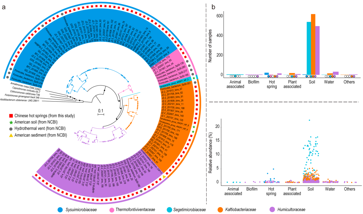 图1 中大微菌门(Sysuimicrobiota)的系统发育(a)及生境分布(b)