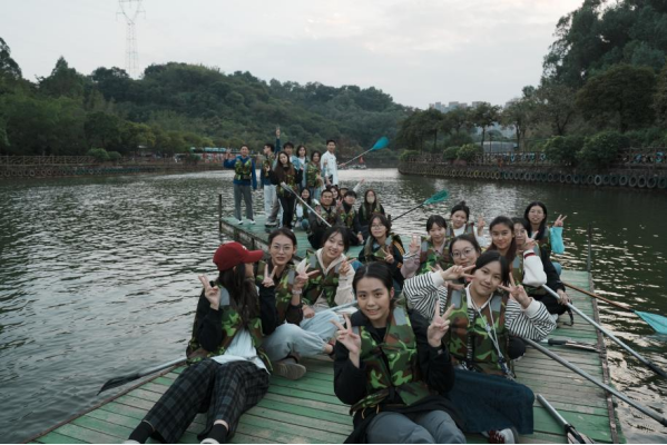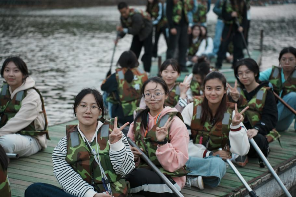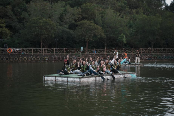 到达长征路终点后,队伍稍作休整便前往了第二个活动点——赤水河畔。在简单分工后,各队同学踏上了竹筏,同心协力将小筏划向终点。喊着有力的号子,同学们挥着手中的船桨,一路高歌猛进。