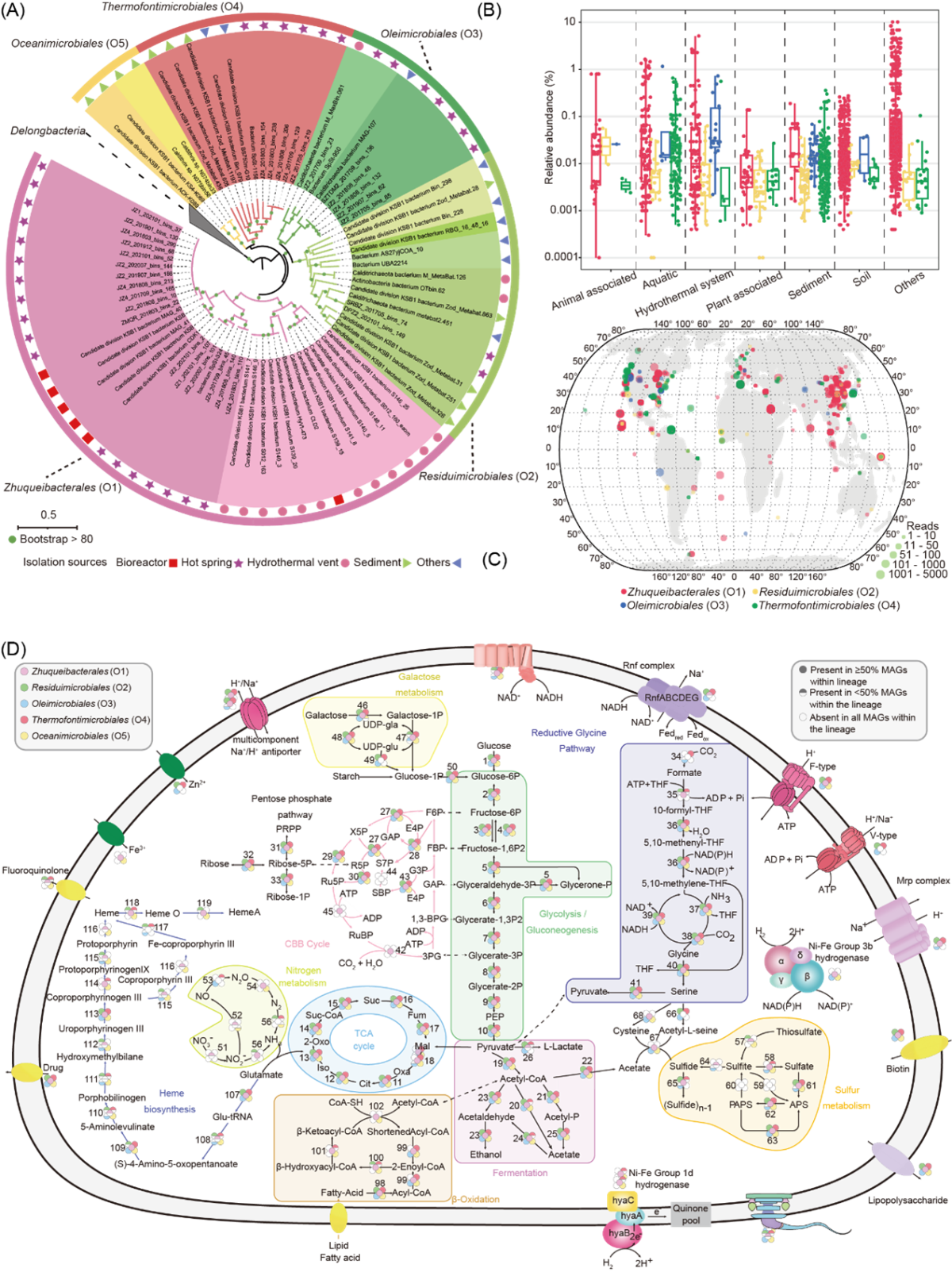 图1 朱雀菌门(Zhuqueibacterota)的系统发育(A)、生境分布、全球分布(B)与代谢模型(D)