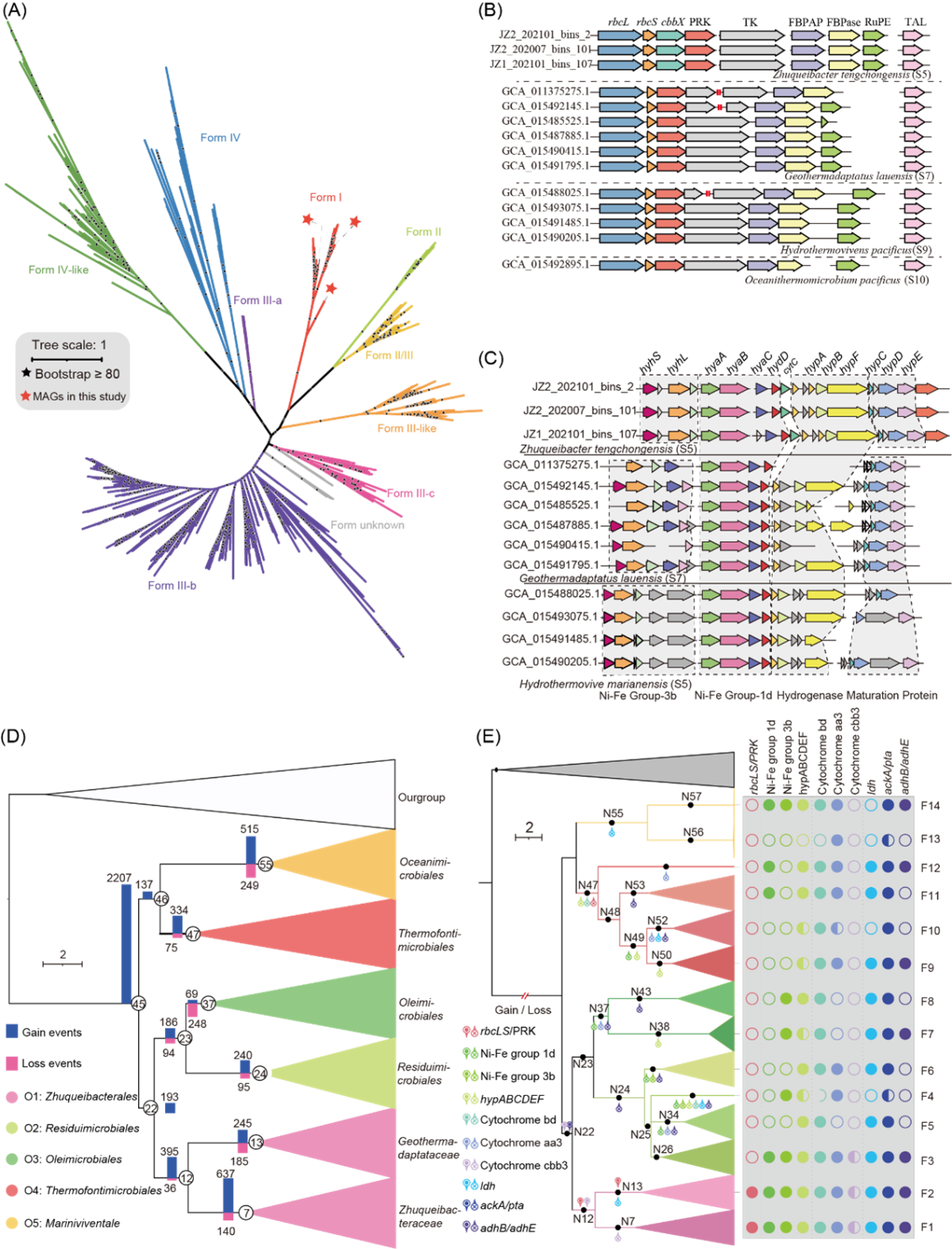 图2 朱雀菌门化能自养能力推断(ABC)与进化历史重构(DE)