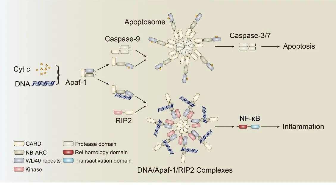 图1. Apaf-1结合不同的配体(DNA或Cyt c)后形成不同的蛋白复合体(Apaf-1/RIP2 complex或apoptosome),从而实现细胞的命运在炎症反应与细胞凋亡之间的进行转换。