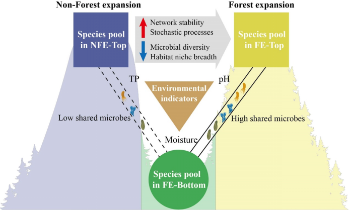 尽管宏观生物方面的研究为理解森林扩张对物种扩散、种群动态和群落结构的影响提供了宝贵的见解,但森林扩张对微生物群落的影响却鲜有研究。微生物群落作为生态系统中的重要组成部分,能迅速响应环境变化。随着森林覆盖面积的增加,微生物的栖息地和生长条件也发生了显著变化。森林扩张通常伴随着土壤有机质的增加和土壤结构的复杂化,这为特定微生物群落,尤其是与植物根系形成共生关系的微生物提供了有利生长条件。微生物群落或许可以作为森林扩张引起的土壤健康和生态变化的重要指示器。因此,深入探讨森林扩张对微生物群落的影响,不仅有助于我们理解森林扩张对生态系统稳定性的综合作用,还能为生态恢复和土壤管理提供科学依据。