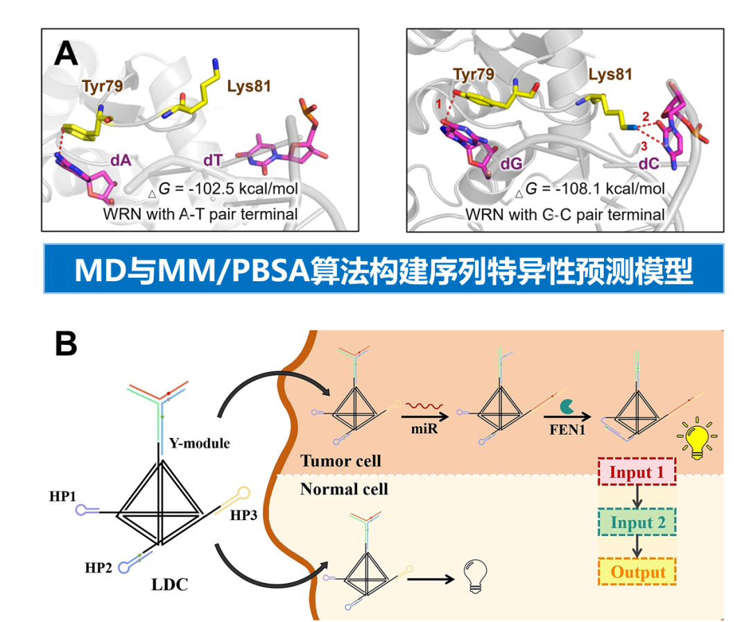 核酸修复酶是指示环境污染物诱导DNA损伤的关键生物标志物,其精准检测对揭示污染物毒性机制至关重要。核酸荧光探针可以被设计以靶向特定的核酸修复酶,实现在活细胞中原位实时监测核酸修复酶,是目前核酸修复酶不可或缺的分析方法(TrAC-Trend Anal. Chem., 2024, 171, 117489.)。针对现有研究缺乏系统性探针设计理论的问题,团队创新性地整合MD模拟与MM/PBSA计算方法,建立了解旋酶WRN与核酸相互作用的序列特异性预测理论,定量阐明了不同解旋酶对核酸探针GC端识别的热力学选择性机制,为特异性探针设计提供了理论基础(Adv. Sci., 2024, 2413368)。针对污染物诱导细胞癌变过程中关键生物标志物miR-21和FEN1,设计了基于DNA四面体的多靶标分析方法,通过构建DNA局域逻辑电路,实现了miR-21和FEN1的特异性同步检测,并成功用于细胞不同状态下生物标志物的变化监测(Anal. Chem., 2025, 97, 6258-6297.)。