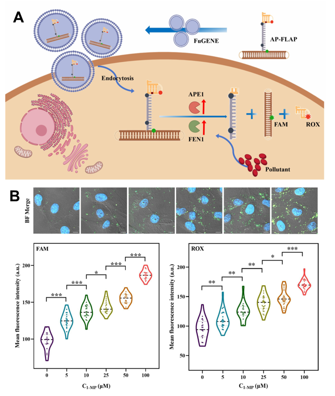 环境污染物暴露会诱导细胞内多种类型DNA损伤,从而导致疾病的发生和发展。团队围绕核酸修复酶与DNA损伤的对应关系,发展了单细胞脱碱基损伤原位检测技术。制备了一种对脱嘌呤/脱嘧啶核酸内切酶1(APE1)高度敏感和特异性识别的核酸探针(ZnO2@DNA),用于指示活细胞中与APE1相关的DNA碱基损伤的位置和程度。研究首次发现苯并芘(BaP)可诱导脱碱基损伤,损伤程度分别与暴露时间(2-24 h)和暴露浓度(5-150 μM)呈正相关(Anal. Chem., 2023. 95(19). 7788-7795.)。进一步的,设计了双酶激活核酸探针,实现了碱基切除修复途径关键修复酶APE1和FEN1活性的同步、独立监测,成功解析了卤代多环芳烃6-Cl-BaP和甲基多环芳烃1-MP暴露后细胞群体中DNA损伤修复响应的异质性模式,发现6-Cl-BaP具有更强的细胞毒性,从单细胞水平阐明了污染物结构差异导致的毒性效应差异及其分子机制(Anal. Chem., 2025, 97, 4841-4849)。