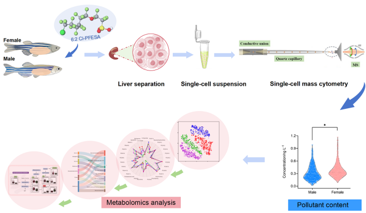 团队结合流式细胞术的高通量特性和质谱技术的组学优势,发展高通量单细胞质谱技术,用于分析单个原代肝细胞内的新型全氟化合物6:2 Cl-PFESA及其内源性代谢物。研究结果显示斑马鱼肝细胞对6:2 Cl-PFESA的积累存在显著的性别差异(p < 0.05),揭示了明显的性别依赖性代谢反应和6:2 Cl-PFESA引发的代谢失调,并强调了性别特异性的毒性反应。本研究证明了单细胞代谢组学在解析污染物暴露的细胞机制及代谢响应方面的可行性,为单细胞水平上的精准、全面毒性评估提供了新的见解(Anal. Chem., 2025, doi: