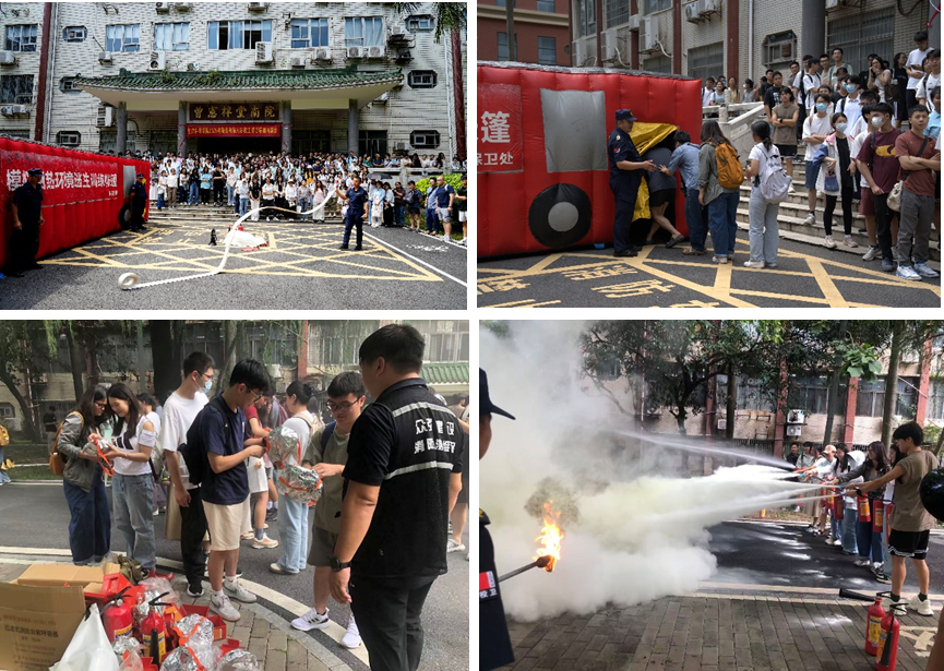 消防器材演习环节,由保卫处校卫队员为师生们开展了常用逃生用具和灭火器材的使用培训。在专业人员的指导下,师生们亲身体验了烟热帐篷,学习了防毒面具、灭火器和消防水带的使用方法,并熟练掌握了逃生技巧和各种灭火器材的操作要领。