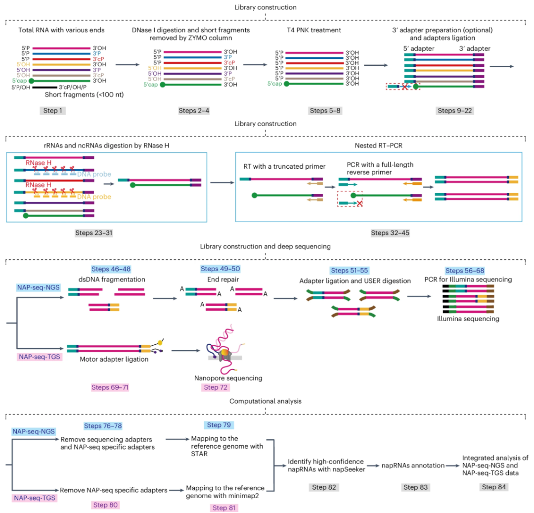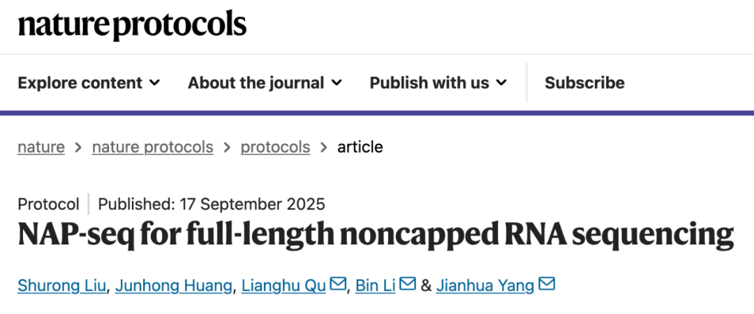 为应对这一挑战,发卡平台 杨建华/李斌/屈良鹄教授团队开发了NAP-seq技术,并于2025年9月17日在Nature Protocols期刊发表了题为:NAP-seq for full-length noncapped RNA sequencing的论文,系统介绍了该方法的设计原理与实验步骤。
