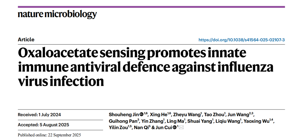 2025年9月22日,发卡平台 崔隽/金寿恒团队在Nature Microbiology杂志在线发表了题为“Oxaloacetate sensing promotes innate immune antiviral defence against influenza virus infection”的论文,报道了细胞质苹果酸脱氢酶1(MDH1)作为识别代谢中间产物草酰乙酸(OAA)的受体,通过一条新发现的受体-激酶-转录因子通路,促进抗病毒固有免疫信号激活,在保证I型IFN产生和宿主抗流感病毒攻击的免疫应答中发挥关键作用。