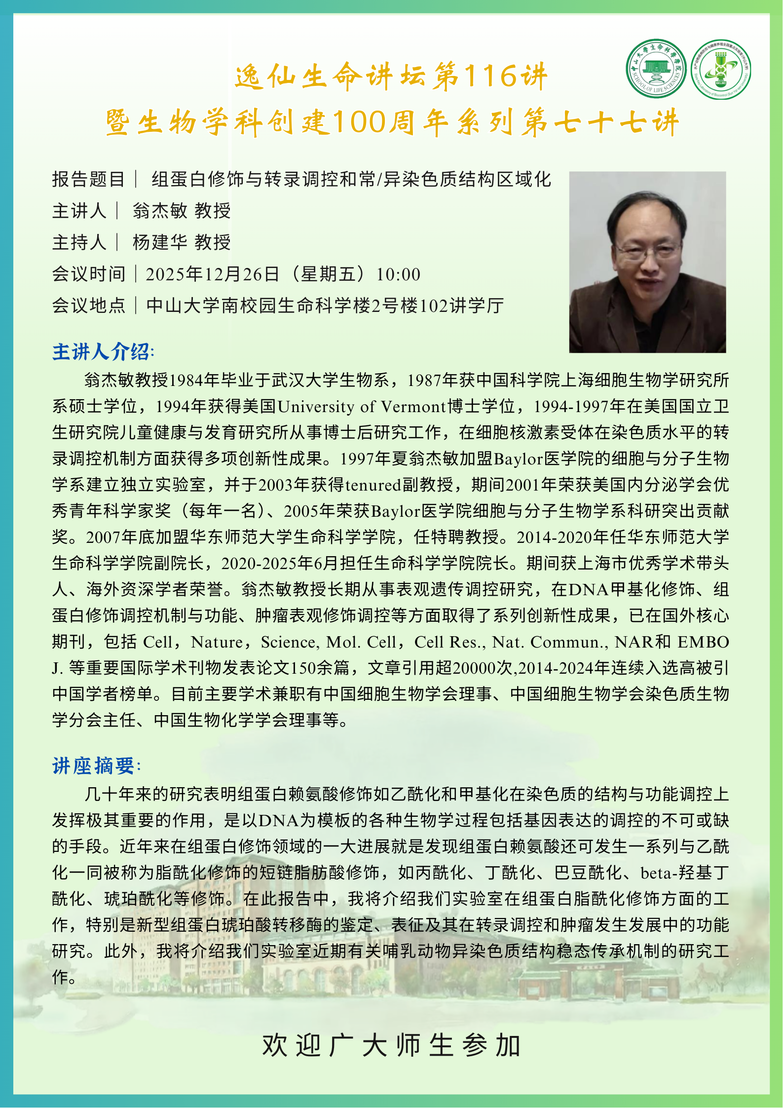 2025年12月26日逸仙生命讲坛116讲:组蛋白修饰与转录调控和常/异染色质结构区域化