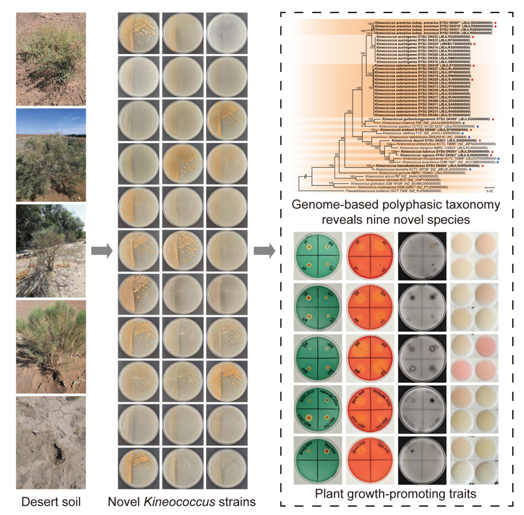 Jie Huang#(黄杰,2023级硕士), Shuai Li†, Zhuo-Huan Zheng, Jun Liu, Yi-Jun Mo, Ting-Ting She, Li-Jia Huang, Wen-Sheng Shu*, Lei Dong*, Wen-Jun Li*. Genome-based polyphasic taxonomy of desert-derived Kineococcus reveals nine novel species with plant growth-promoting traits. Journal of Systematics and Evolution, 2025, 70020.