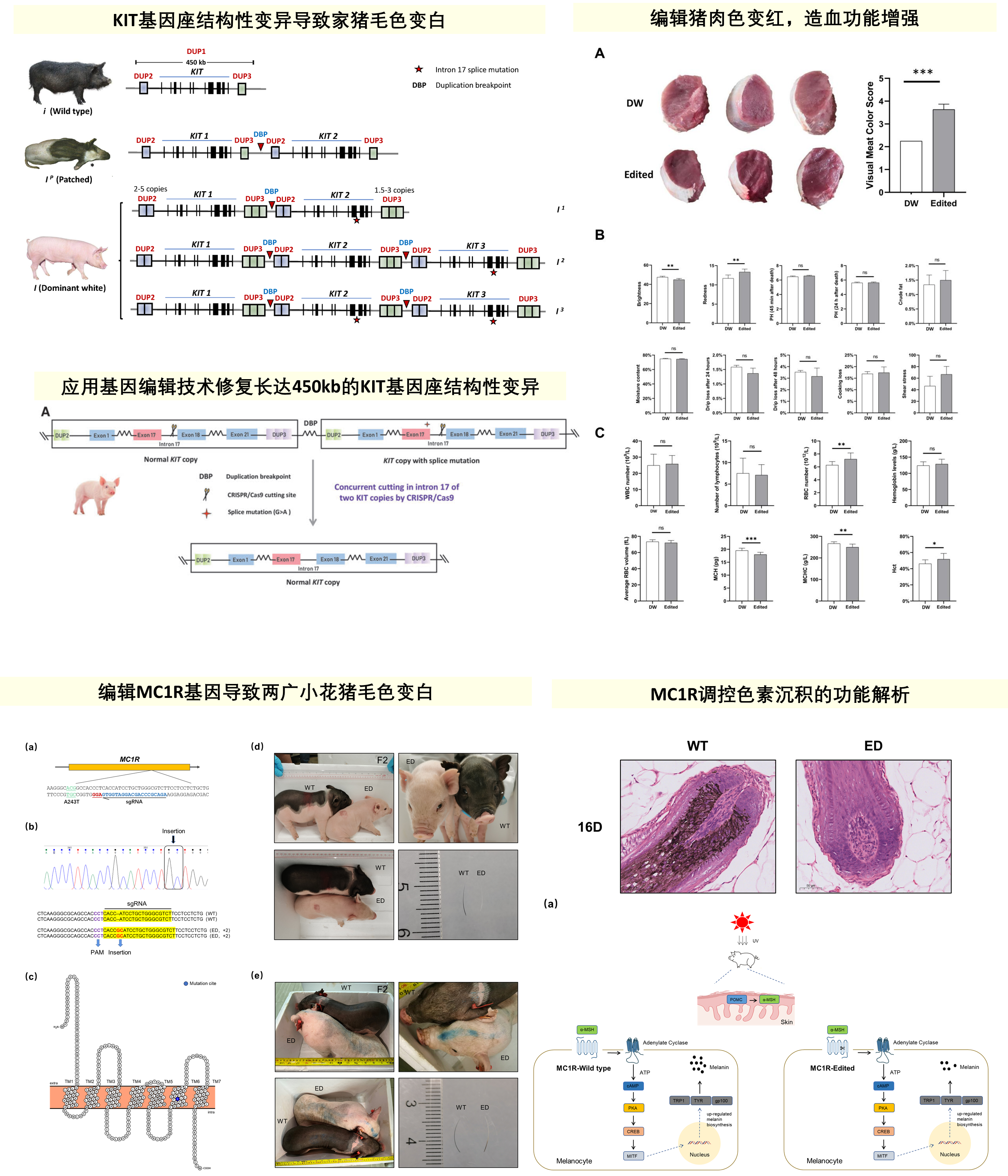 4. 毛色是决定家猪品种特征和商品猪销售价值的重要性状。修复KIT结构性变异的大白猪肉色性状大幅提升,并可用于杂交生产黑色优质商品猪,丰富了优质猪配套组合,具有较大的市场应用前景;MC1R基因编辑猪毛色发生显著性改变,证明其是控制家猪色素积淀的关键基因,为家猪毛色修饰提了新策略。