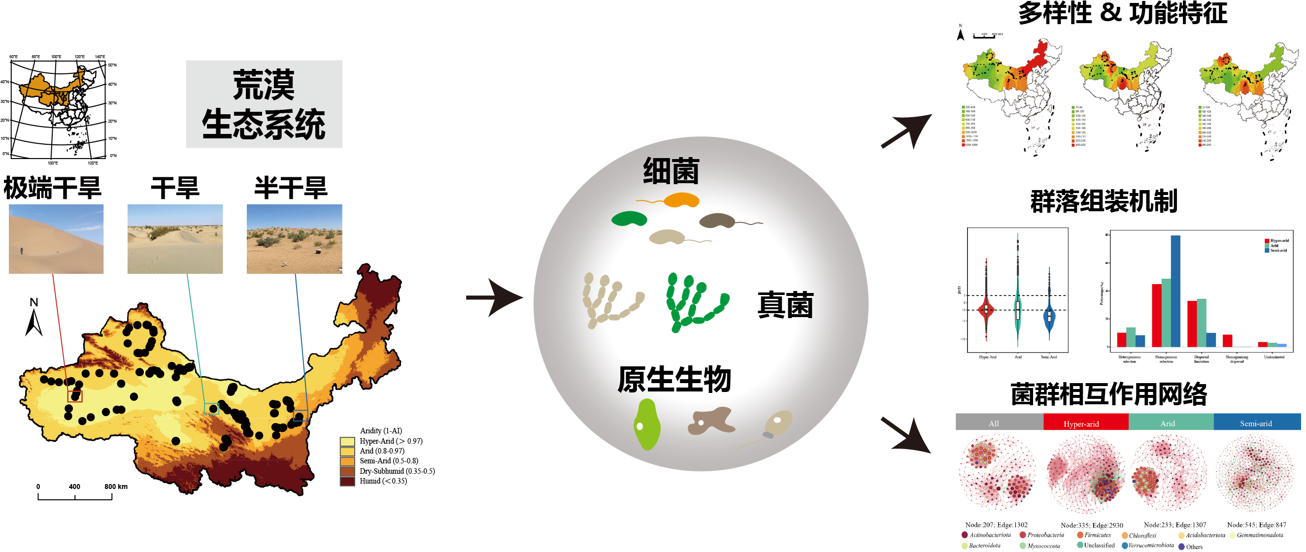 1.1 基于大规模系统性采样,首次系统揭示我国荒漠生态系统中微生物多样性地理分布格局及群落构建机制(裸土及代表性植物)