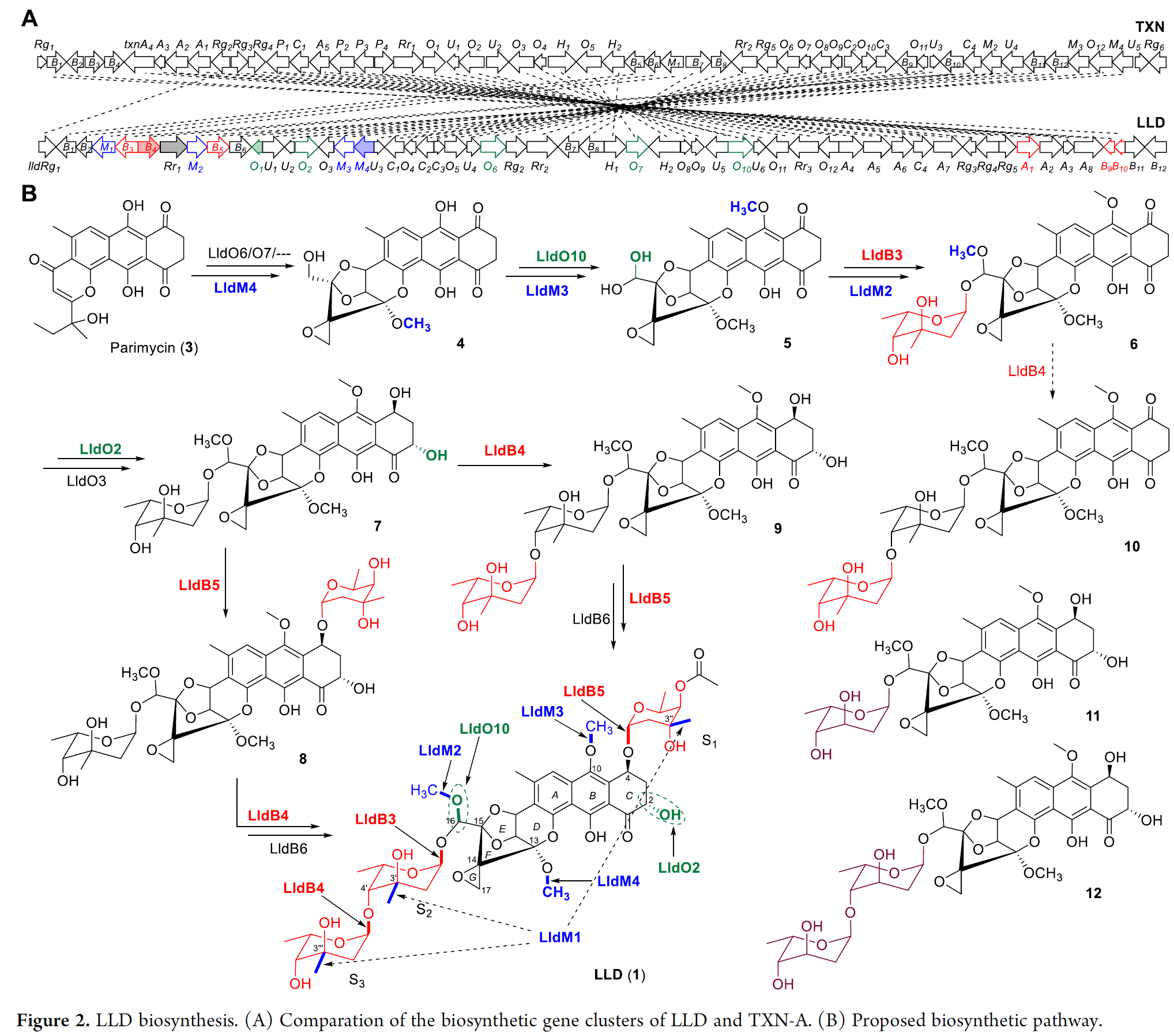 3.3 基于抗肿瘤聚酮化合物LL-D49194α1的生物合成机制研究,首次鉴定并阐明了其生物合成基因簇及后修饰通路,明确了两个成药性表现极佳的新颖先导化合物,可用于进一步临床新药研发